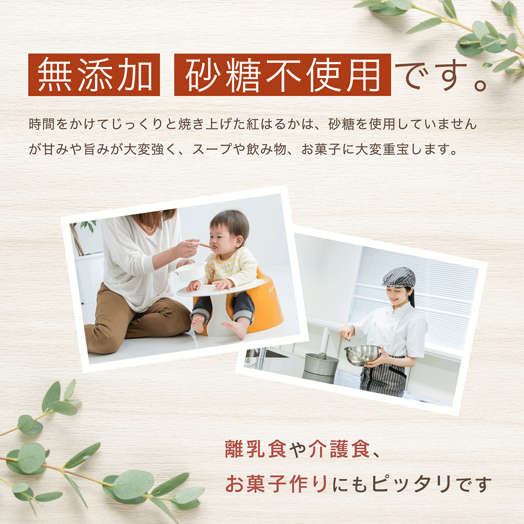 じっくり時間をかけて焼き上げた紅はるかは、砂糖を使用していませんが甘みや旨みが大変強く、スープや飲み物、お菓子に大変重宝します。